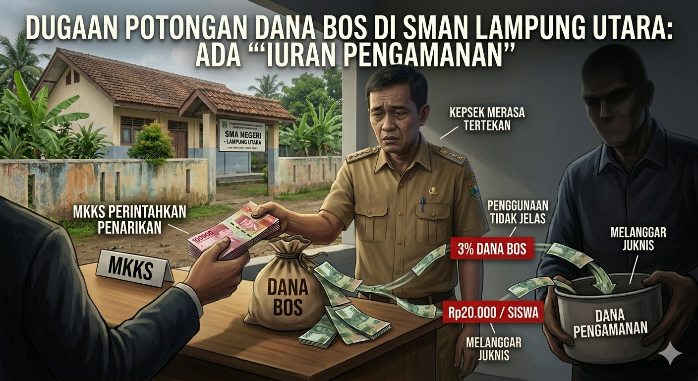 Lampung Utara LM – Pengelolaan Dana Bantuan Operasional Sekolah (BOS) di sejumlah Sekolah Menengah Atas (SMA) negeri di Kabupaten Lampung Utara kembali menjadi perhatian. Sejumlah kepala sekolah mengaku adanya potongan dana sebesar 3 persen dari total BOS yang diterima, ditambah pungutan Rp20.000 per siswa.