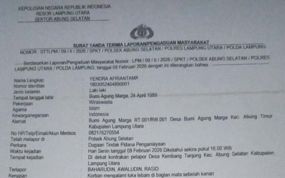 Laporan tersebut telah diterima dan tercatat dengan nomor LPM/09/II/2026/SPKT/POLSEK ABUNG SELATAN/POLRES LAMPUNG UTARA/POLDA LAMPUNG terkait dugaan tindak pidana penganiayaan.